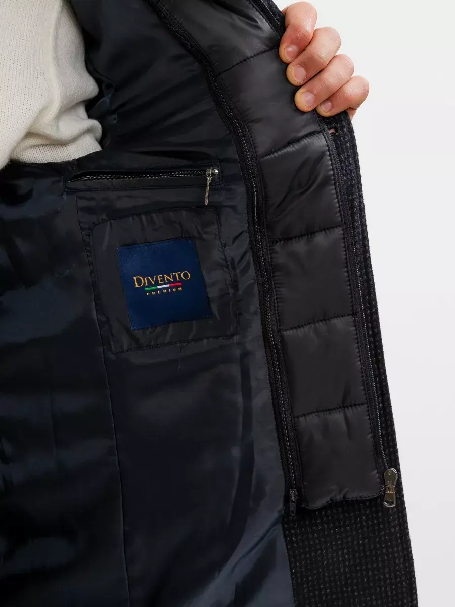 Полуприлегающий пиджак Divento черного цвета с серой отделкой из смеси шерсти, вискозы, полиэстера. Воротник отложной с лацканами классической формы, одна шлица, застежка на три пуговицы. Боковые карманы с клапанами и нагрудный прорезной карман дополняет аккуратный карман ticket pocket, оформленный контрастной тканью. Пиджак можно носить как самостоятельно, так и в комплекте с любыми классическими брюками. Пиджак имеет несколько посадок, с 46 по 56 - полуприлегающий силуэт;с 58 по 66 - прямой.